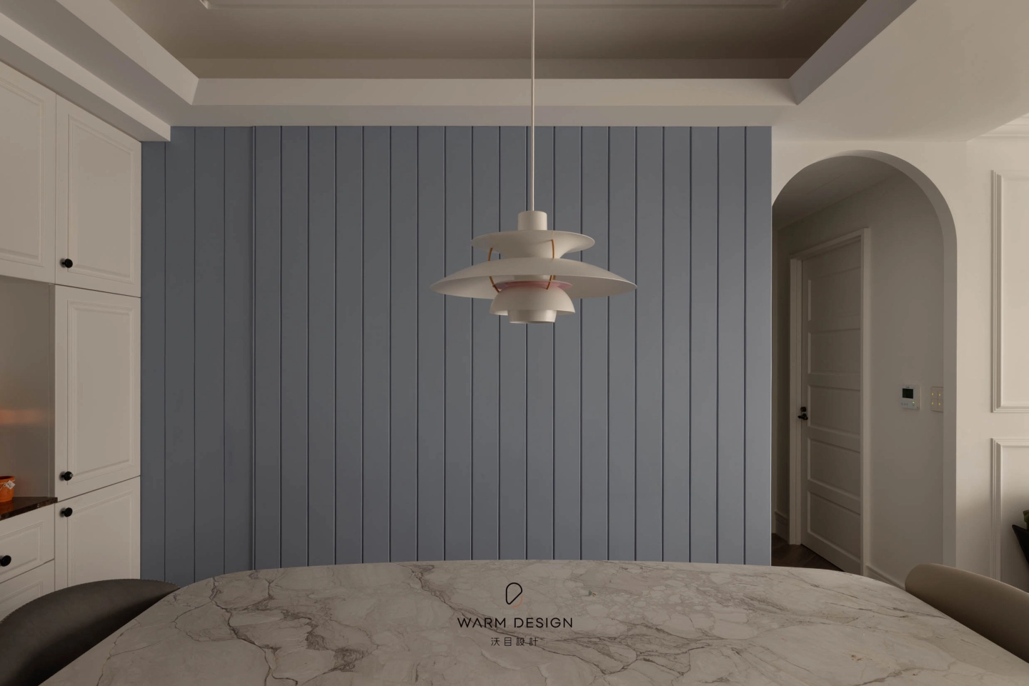 延續整體牆面語彙,以簡潔吊燈與石紋餐桌作為視覺焦點,保留用餐區應有的儀式感,也讓日常生活不顯過度隆重。