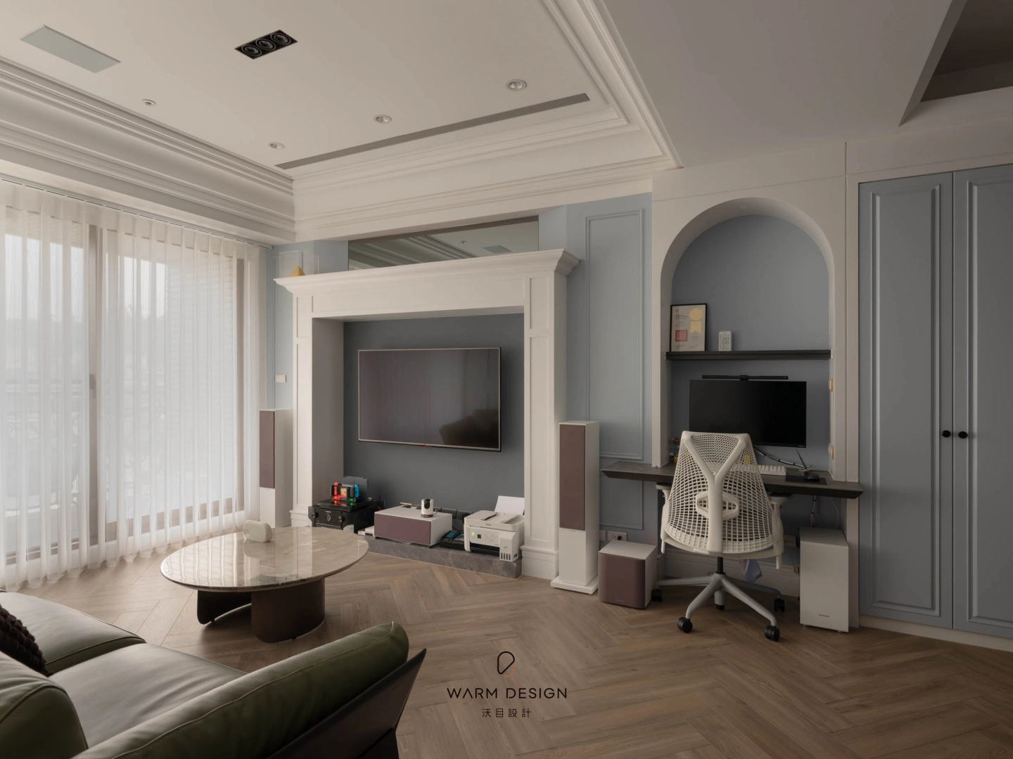 以白色線板與灰藍立面建立主要視覺,搭配大面採光與淺色窗紗,讓空間在保有新古典層次的同時,依然維持輕盈與明亮。深色沙發與圓形茶几則為空間加入穩定感與生活感。
